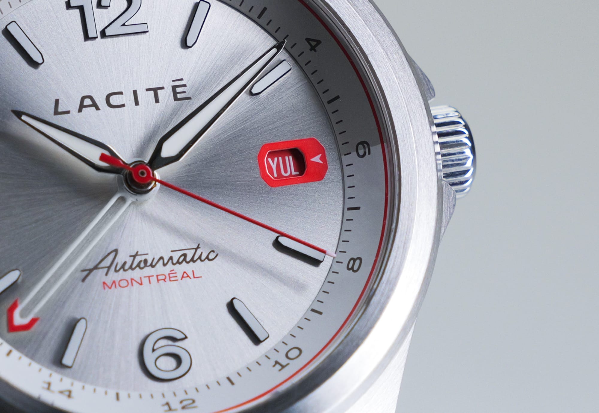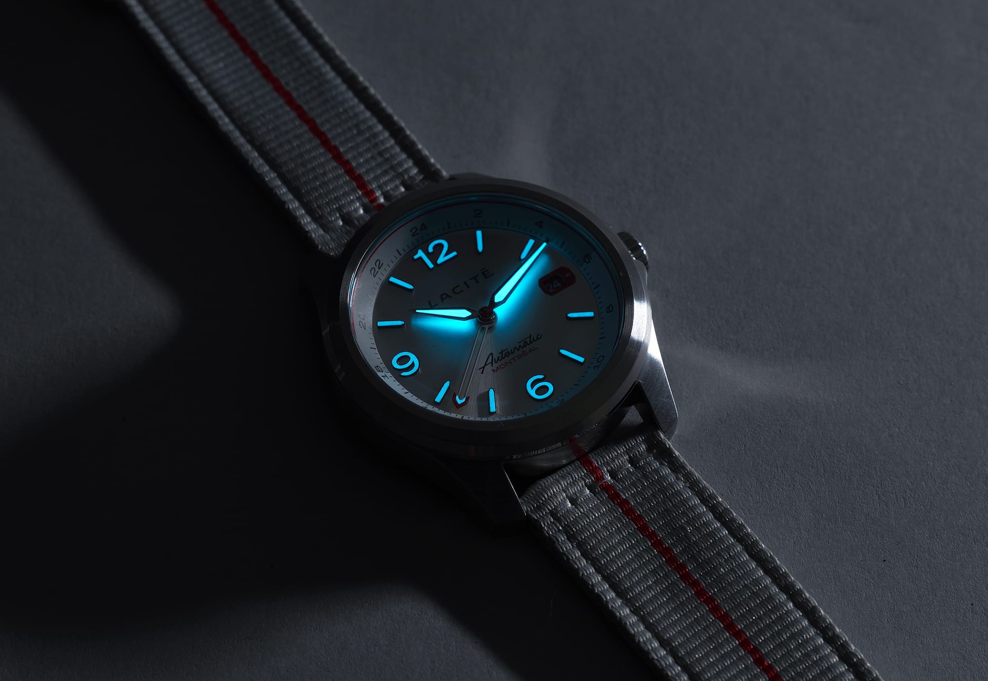 Conçue pour la vie entre les fuseaux horaires, cette montre allie polyvalence au quotidien et fonctionnalité voyage. Elle est livrée avec deux bracelets interchangeables : un bracelet en acier inoxydable et un bracelet en nylon aux couleurs de Montréal. Chaque montre est assemblée à la main à Montréal.